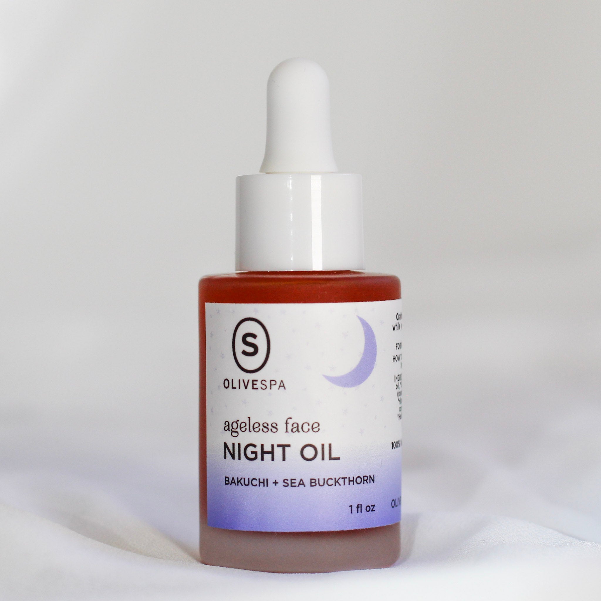 Our Ageless Face Night Oil is a beautiful blend of nutritious oils, including sea buckthorn, helichrysum, plum kernel, and the star ingredient: bakuchi oil.