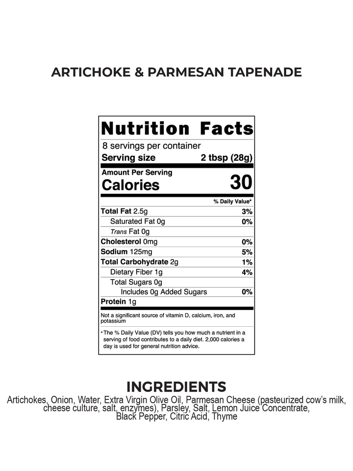 Legendary on a cheese or charcuterie board, our Artichoke and Parmesan tapenade is sure to impress your guests and their taste buds. Great as a dip or spread on toasted baguette slices, bagels, crackers, or vegetables.