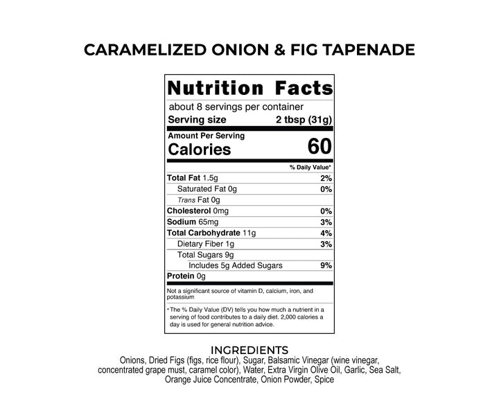 Onions, Dried Figs (figs, rice flour), Sugar, Balsamic Vinegar (wine vinegar, concentrated grape must, caramel color), Water, Extra Virgin Olive Oil, Garlic, Sea Salt, Orange Juice Concentrate, Onion Powder, Spice