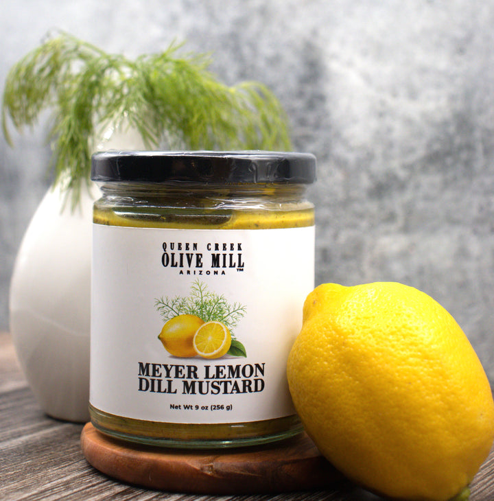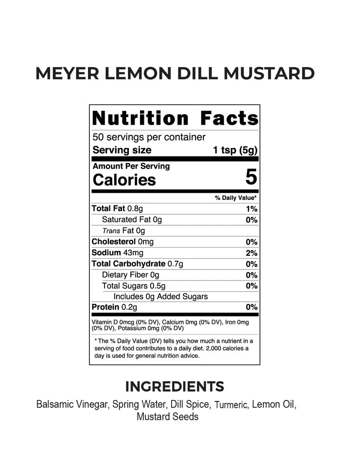 Our Meyer Lemon Dill Mustard brightens dishes with vibrant citrus and fresh dill, balanced by tangy balsamic and smooth mustard seeds.