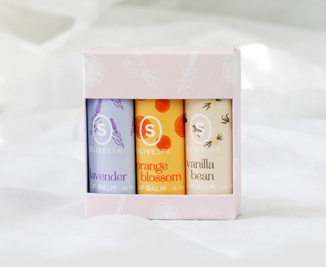 Try 3 different natural essential oil flavors of our nourishing olive oil lip balms.