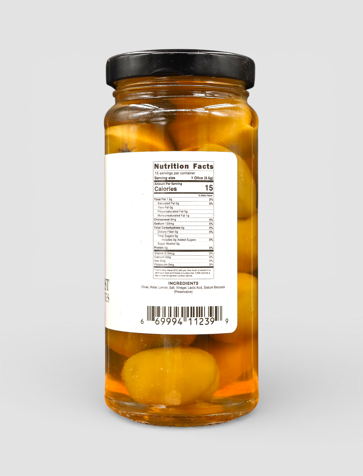 These olives shine as a cocktail garnish, especially in martinis, where the lemon adds a crisp, aromatic twist. They are equally at home on charcuterie and cheese boards, paired with cheeses, crackers, dried fruits, and tapenades. Whether you are entertaining or elevating a simple drink, these olives add a refreshing burst of flavor to every bite.
