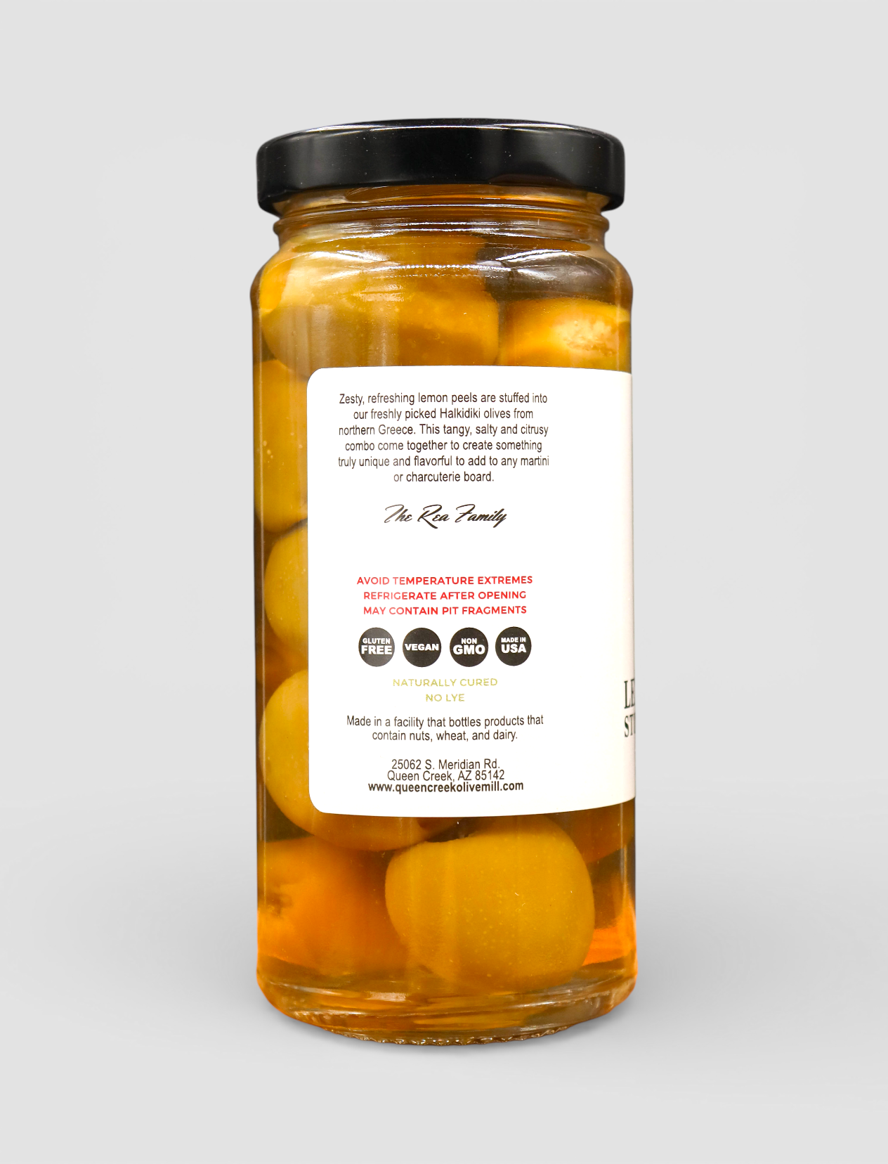 Our Lemon Twist Stuffed Olives start with premium Halkidiki olives from northern Greece, known for their firm texture and buttery bite. Each olive is carefully stuffed with fragrant lemon peel, creating a lively balance of salty, tangy, and citrus-forward flavor that feels both classic and unexpected.