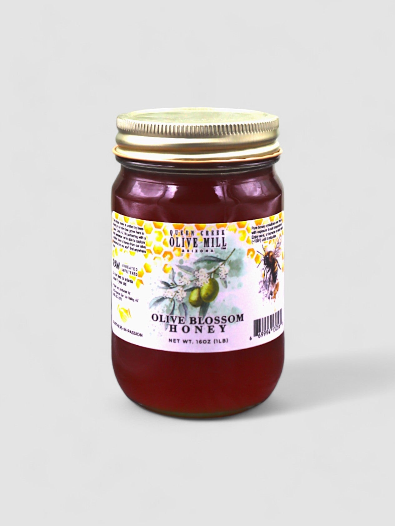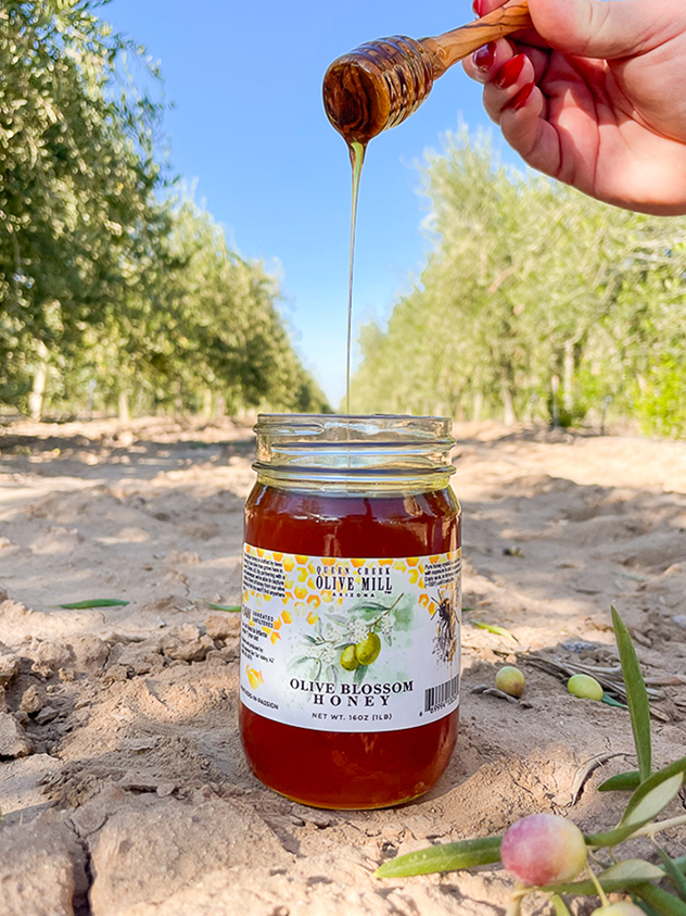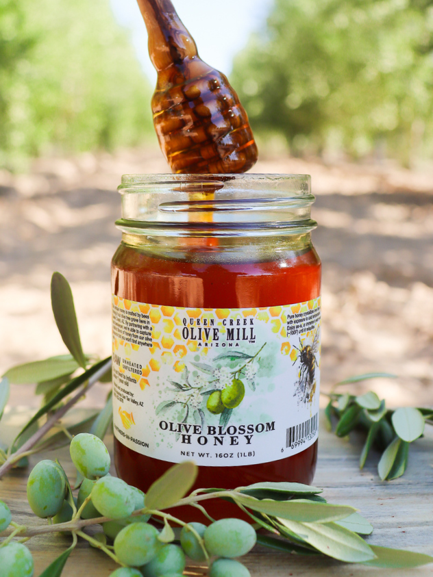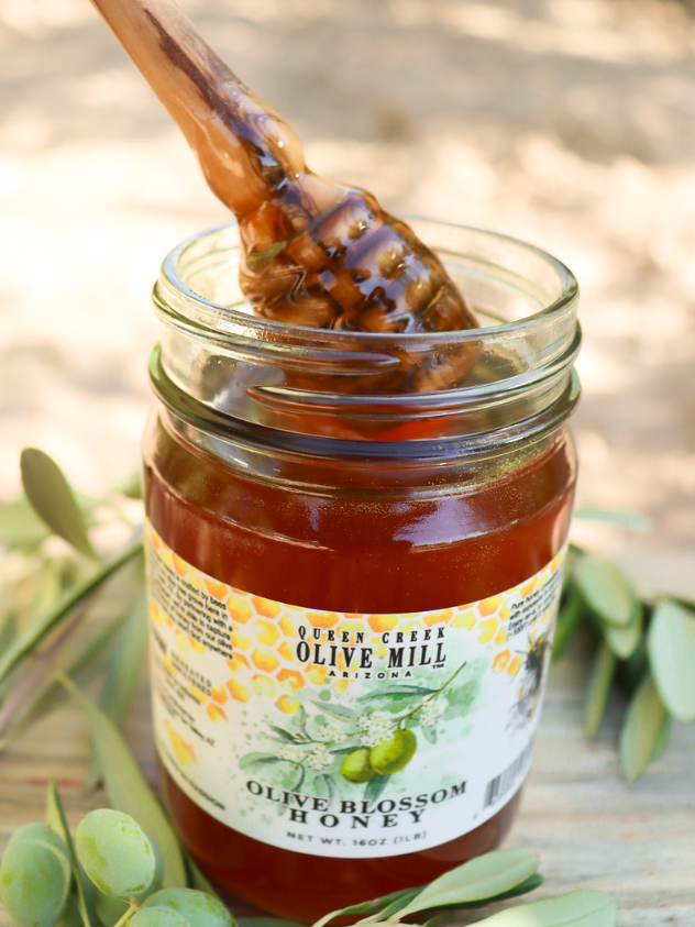 This unique honey is crafted by bees thriving in our own olive tree grove here in Queen Creek, Arizona.