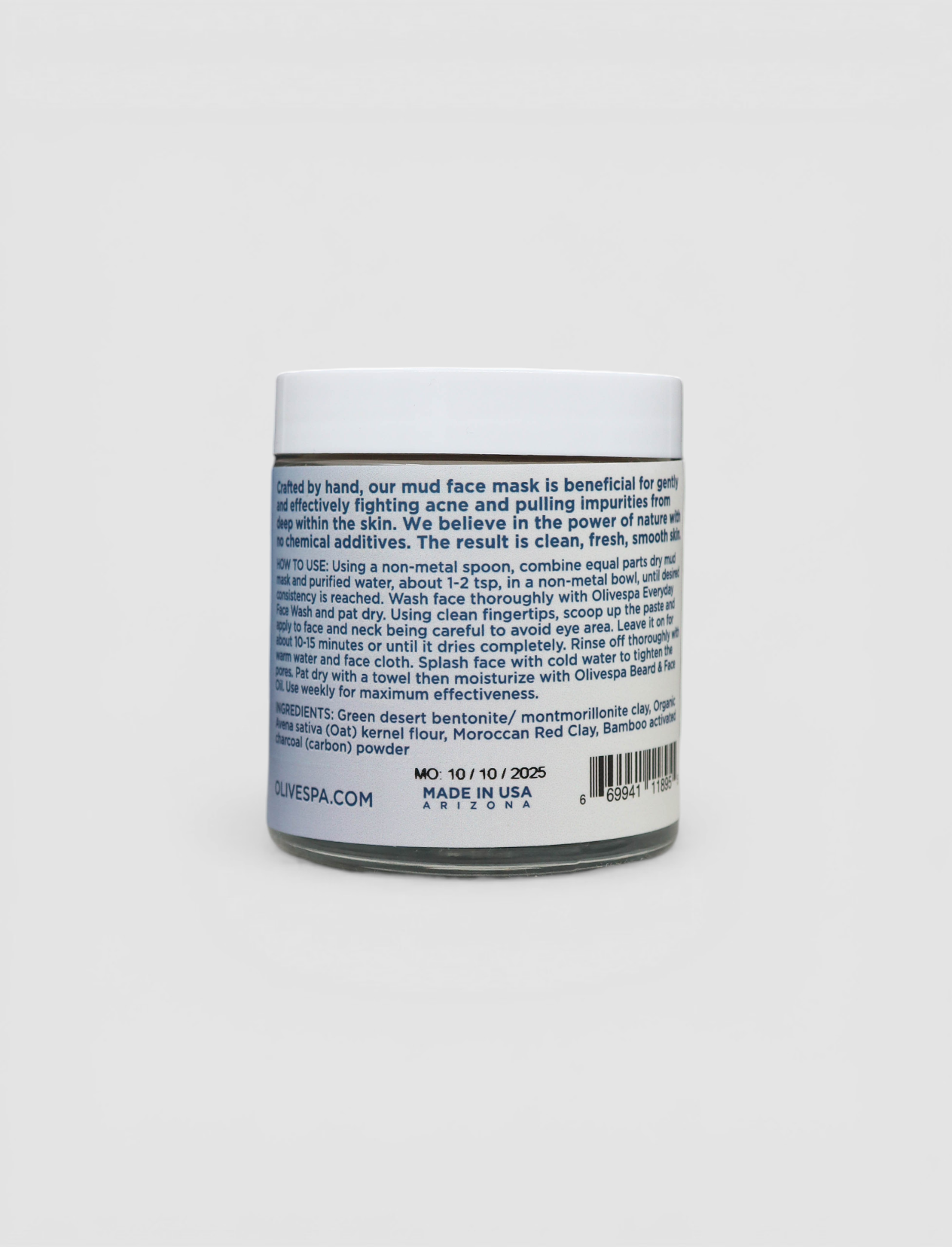 Using a non-metal spoon, combine equal parts dry mud mask and purified water, about 1-2 tsp, in a non-metal bowl, until desired consistency is reached. Wash face thoroughly with Olivespa Everyday Face Wash and pat dry. Using clean fingertips, scoop up the paste and apply to face and neck being careful to avoid eye area. Leave it on for about 10-15 minutes or until it dries completely. Rinse off thoroughly with warm water and face cloth. Splash face with cold water to tighten the pores. Pat dry with a towel then moisturize with Olivespa Beard & Face Oil. Use weekly for maximum effectiveness.