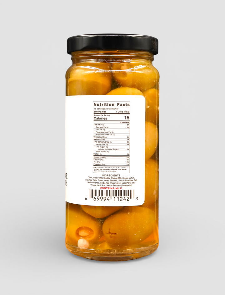 Olives, Water, White Cheddar Cheese (Milk, Cheese Culture, Enzymes, Water, Cream, Whey, Skim Milk, Sodium Phosphate, Salt, Sodium Alginate, Sorbic Acid (preservative), Lactic Acid), Vinegar, Lactic Acid, Salt, Sodium Benzoate