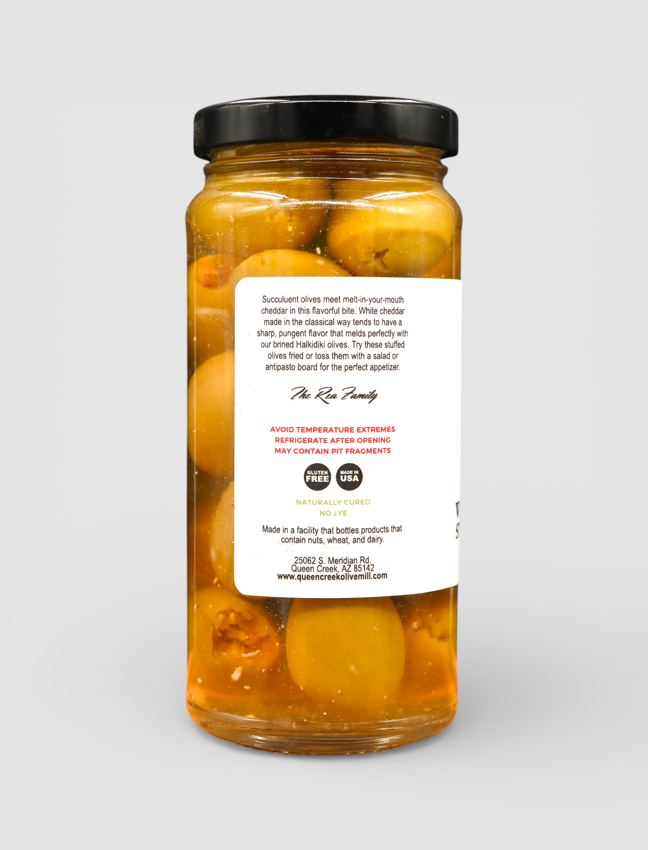 Our White Cheddar Stuffed Olives pair extra-large brined Halkidiki olives with smooth, sharp white cheddar for a perfectly balanced blend of salty and creamy. The classic cheddar flavor adds depth and richness, making these olives a standout for entertaining, snacking, or elevating everyday dishes. Enjoy them straight from the jar, lightly fried for a warm appetizer, or served alongside your favorite spreads and cocktails.