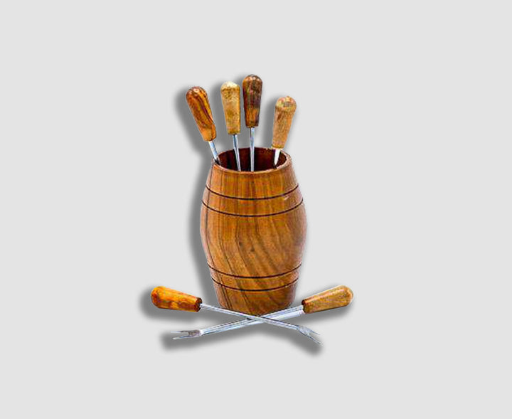 A must for any olive lovers. This olive wood barrel contains 6 olive picks (little forked spears with olive wood handles).