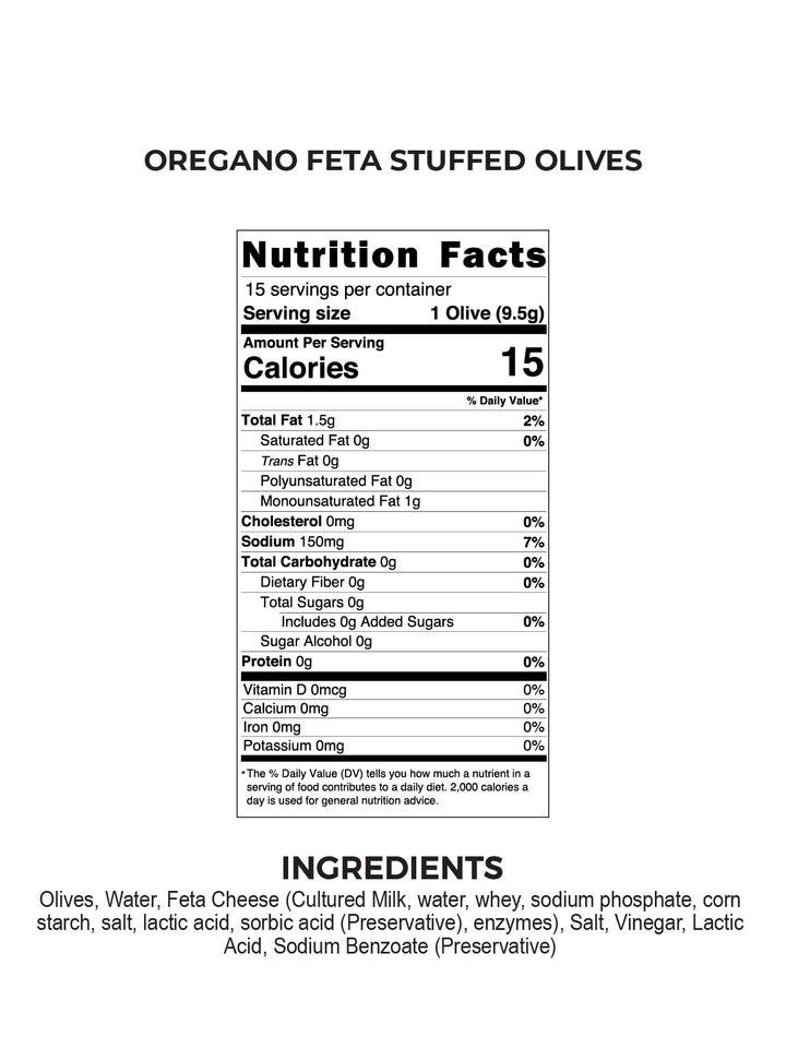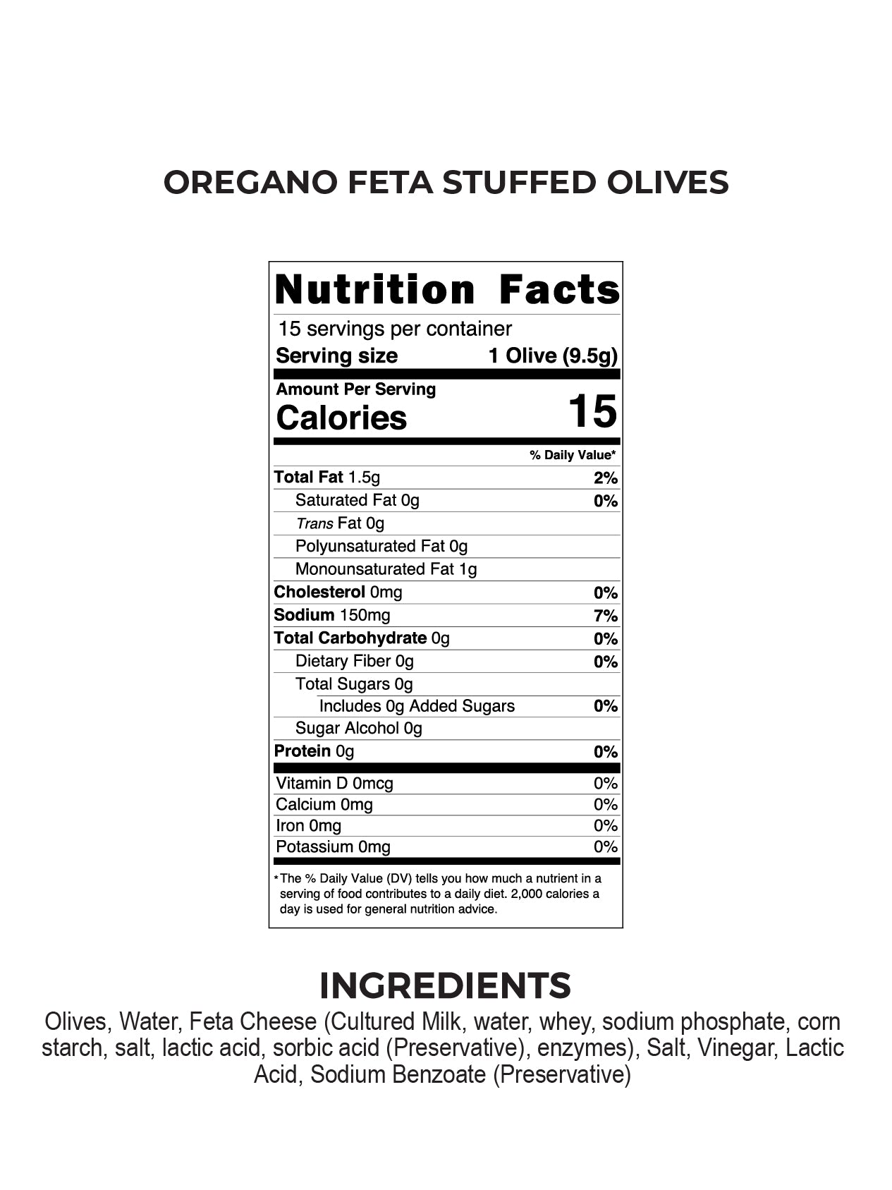 Cherished by the Greek Gods, these little gems are a favorite on Mount Olympus and a beloved staple in your kitchen. We take fresh creamed feta cheese and dried Greek oregano and stuff them into our crisp, crunchy green olives. This yields a salty and tangy stuffed olive that is a unique addition to level up a plain ol’ Greek salad. Or, try them on your favorite cocktail cracker, chopped into a vinaigrette, or as a garnish on a Mediterranean-inspired martini. Martini lovers beware: you’ll never go back to a normal martini after using our stuffed olives as a garnish.