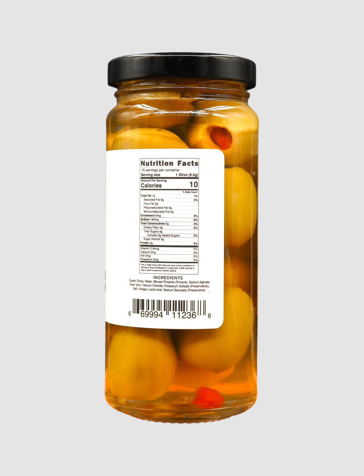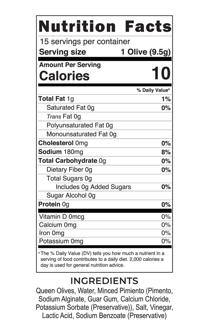 Queen Olives, Water, Minced Pimiento (Pimento, Sodium Alginate, Guar Gum, Calcium Chloride, Potassium Sorbate (Preservative)), Salt, Vinegar, Lactic Acid, Sodium Benzoate (Preservative)