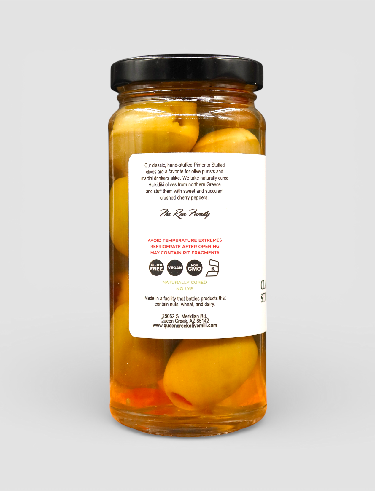 Our Pimento Stuffed Olives are a true original and a must-have for any olive lover. Naturally cured green olives are hand-stuffed with vibrant, sweet pimento peppers, creating a flavor that’s bright, balanced, and endlessly snackable.