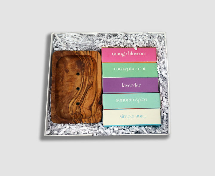 Our Rainbow Soap Gift Box includes an olive wood soap dish and five beautifully scented handcrafted soaps! Our natural olive oil soap lathers beautifully producing a rich thick lather free of chemicals and preservatives. Treat yourself or anyone on your list!