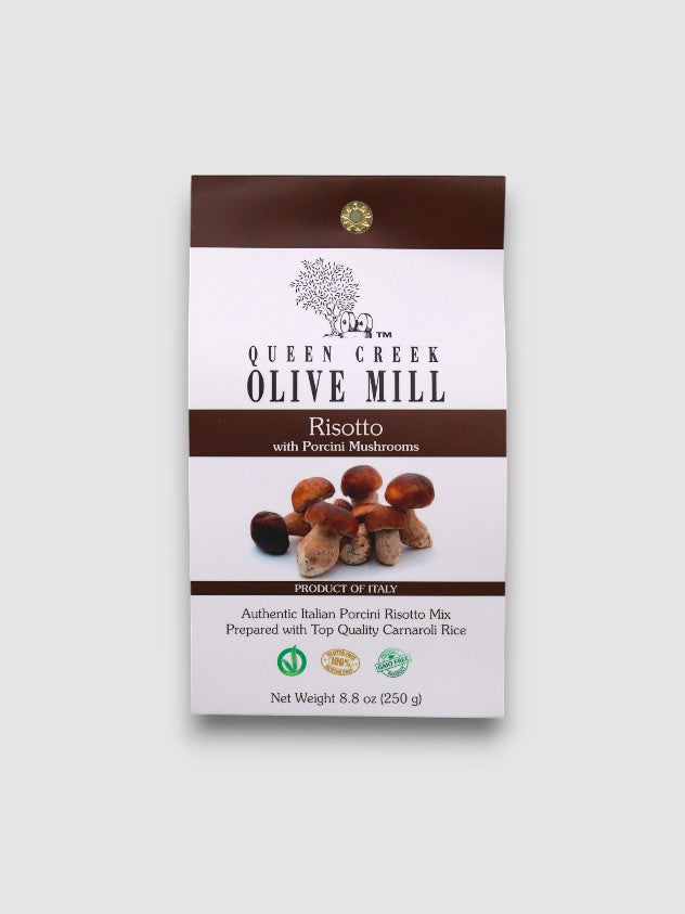 Ingredients: Superfine Carnaroli rice (92%), Porcini mushroom broth without MSG (salt, potato flour, yeast extract, potato maltodextrin, dried Porcini mushrooms (7%) dehydrated vegetables (onion, carrot, and garlic) sunflower seed oil, seasonings, pepper), dried Porcini mushrooms (2%) (Boletus Edulis), onion, garlic, and parsley.