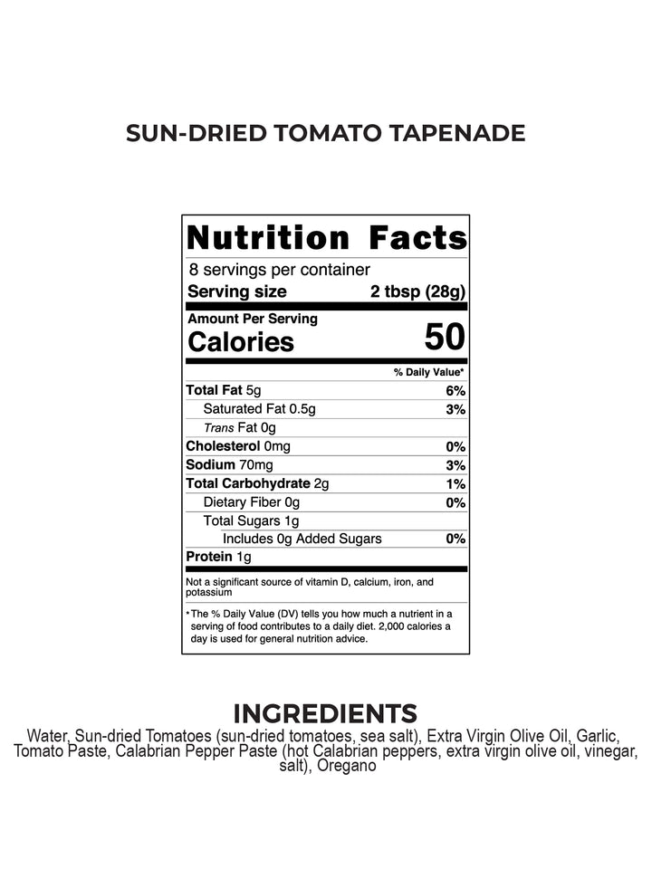 Ready to serve straight from the jar, pair our Sundried Tomato Tapenade with crostini and crackers, or as bruschetta on freshly toasted baguette slices. Get creative, and add it to your favorite cooked pasta and top with freshly grated Parmesan cheese, or use it as a spread to make a delicious sandwich.