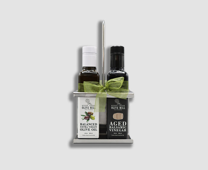 This delicious centerpiece carries our two 'essential' products. Our Balanced Extra Virgin Olive Oil & Aged Balsamic Vinegar from Modena Italy. This set is a kitchen staple and makes for the perfect gift for the foodie in your life!