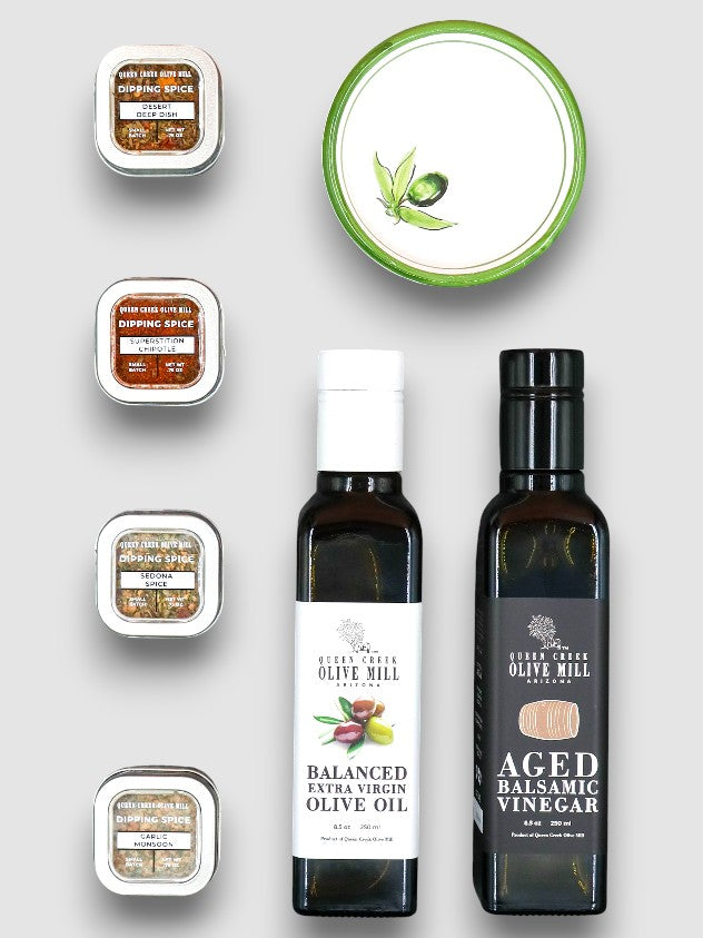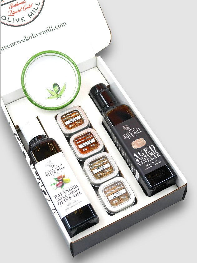 This gift set, featuring our Balanced Extra Virgin Olive Oil, Aged Balsamic Vinegar, and a variety of dipping spices, is the perfect starter kit for both cooking enthusiasts and beginners alike.
