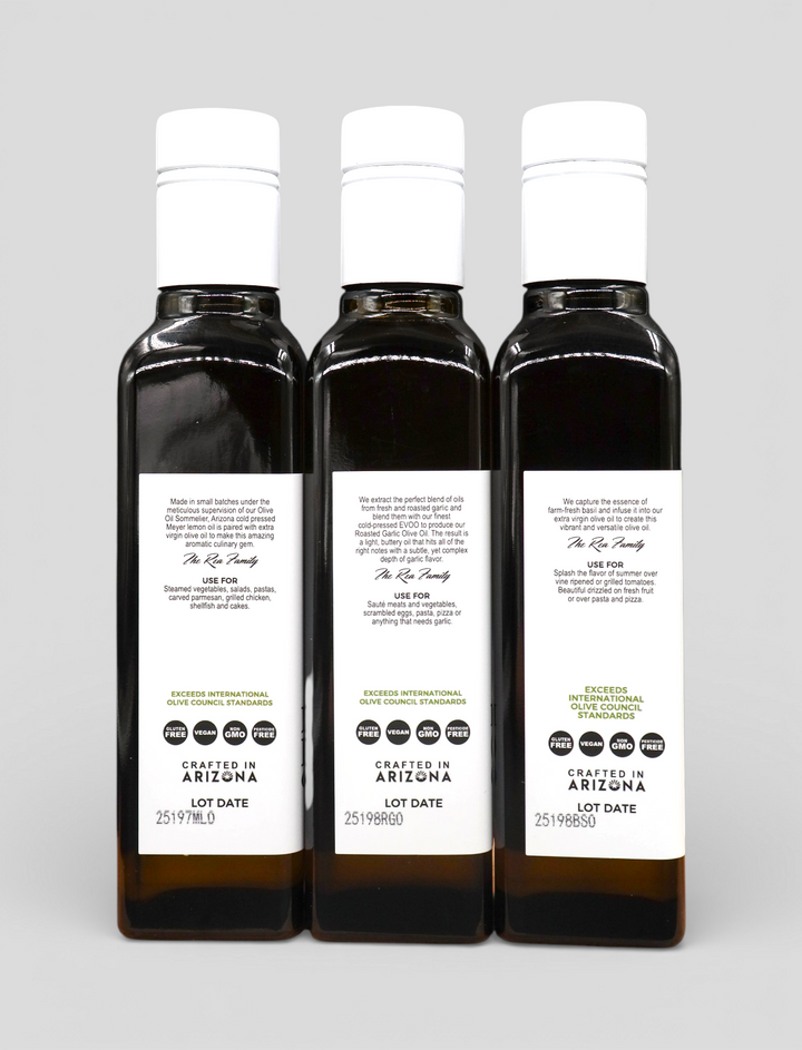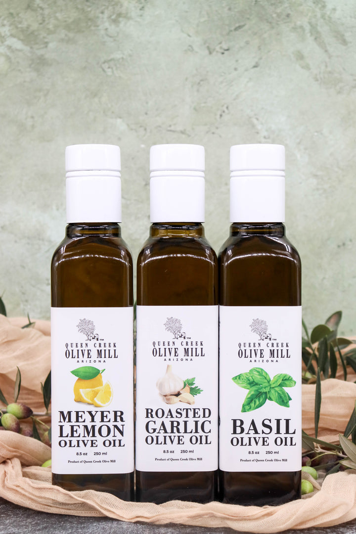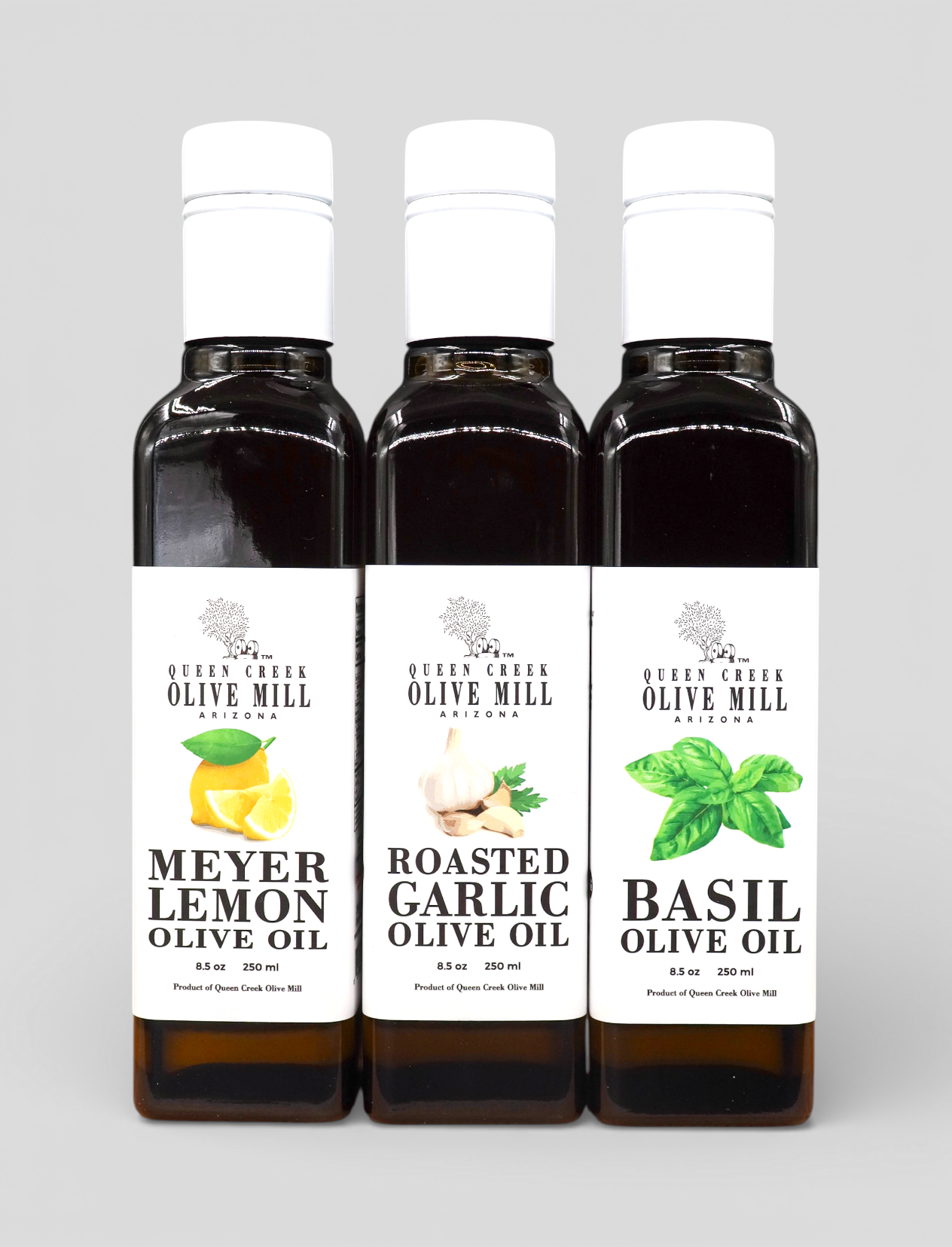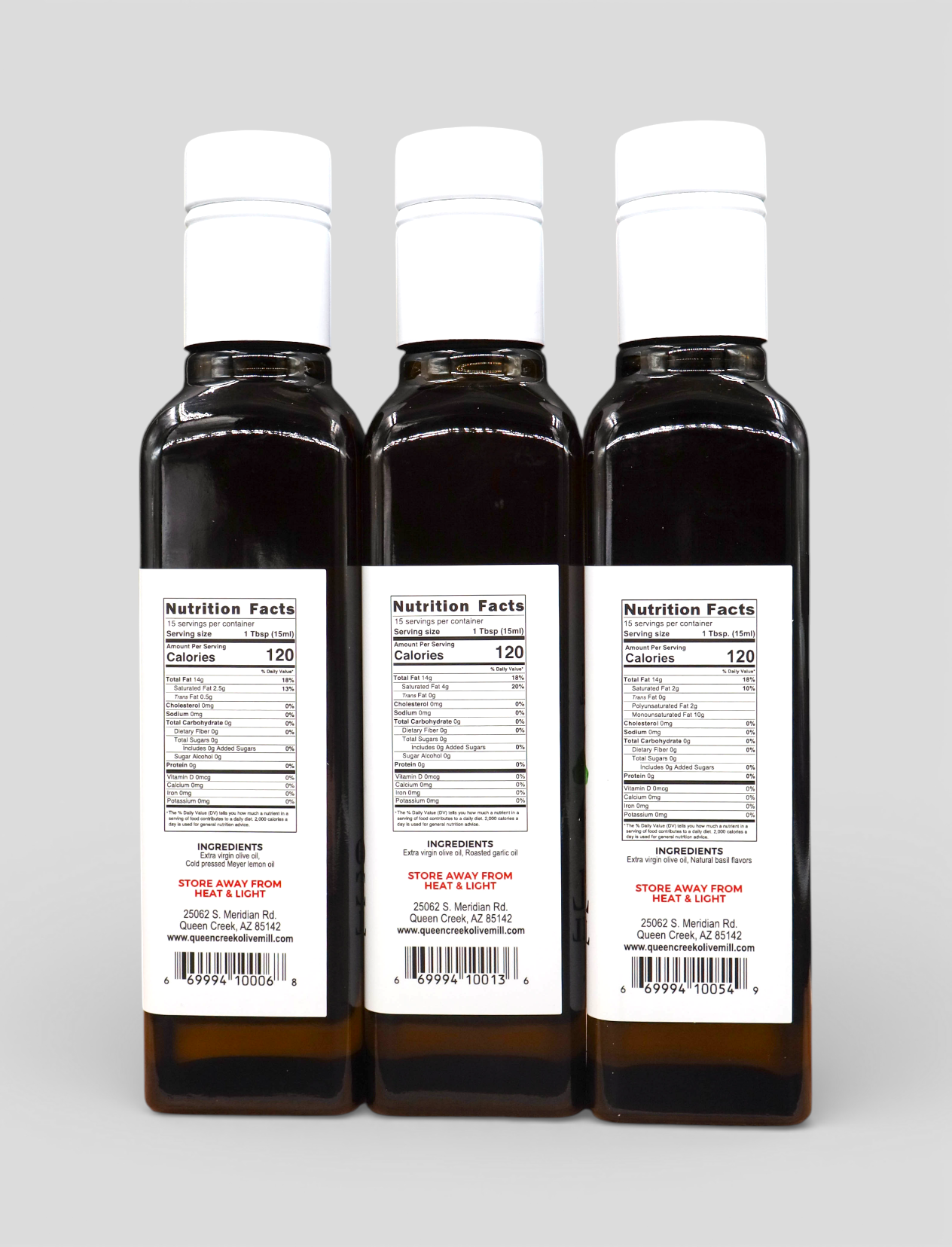Includes Meyer Lemon Olive Oil, Roasted Garlic Olive Oil and Fresh Crush Basil Olive Oil