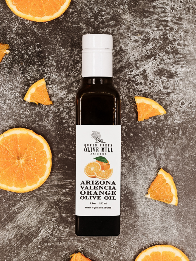 Arizona cold-pressed Valencia orange oil is expertly blended with extra virgin olive oil to make this show-stopping culinary secret weapon. Our Valencia Orange Olive Oil is pleasantly light, flaunting a bright, fresh aroma, a fruity, citrusy flavor profile, and a smooth finish.
