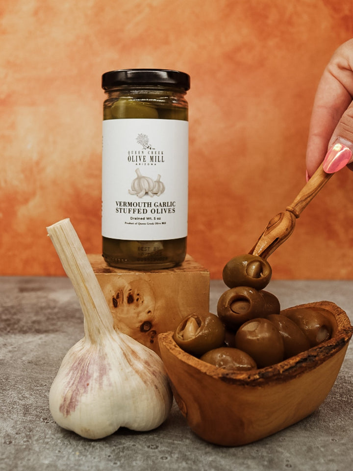 - Our Vermouth Garlic stuffed olives are a staple. Keep on hand for spur-of-the-moment entertaining, impressive charcuterie and cheese boards, and delicious martinis.